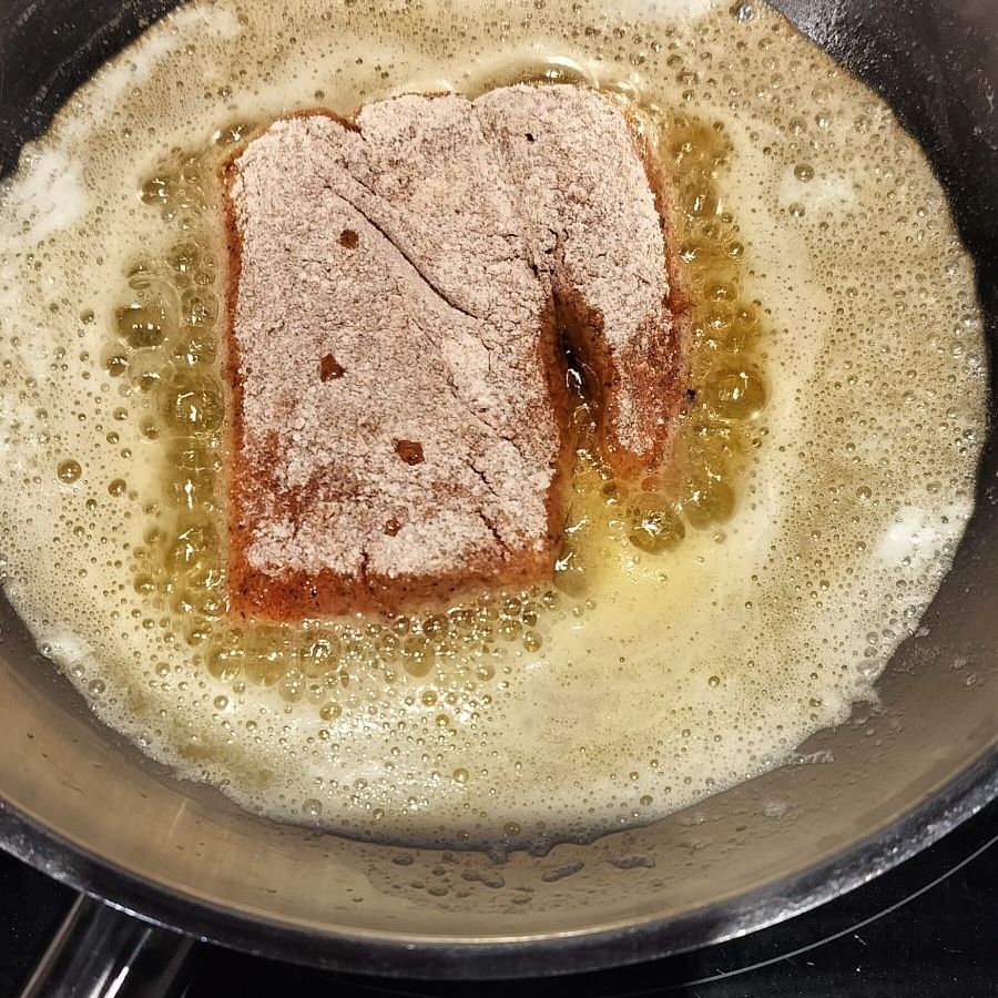 It’s now time to start the main dish of red fish. Again melt a good amount of butter in a pan, season the fish and the flour you will be coating the fish. Once the butter is hot add the fish being sure to lay the fillet in the pan away from you so if the hot butter splashes it will be away from you. (Nice tip I normally just plop my meat into the middle of the hot liquid. I do it slowly, but now I’ll add that extra step.