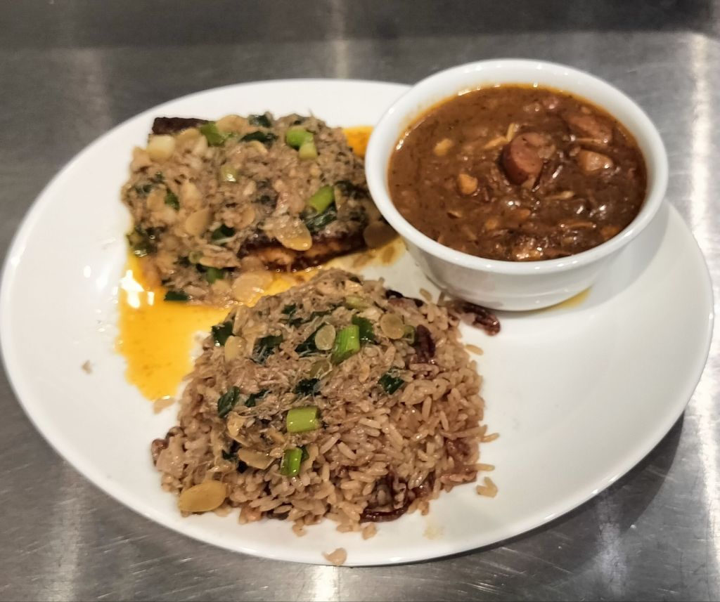 I’m not going to give you the whole recipe here, because you need to take the class. But here is the pot of gumbo after the rue, sausage and chicken are combined together with chicken stock and a spice blend. This will continue to simmer on low while you prepare the rice and fish.