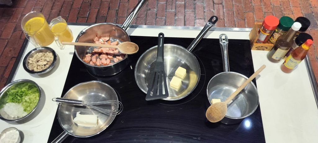 I recommend taking the cooking class if you are every in New Orleans. Don’t do the demonstration followed by a meal class, pay for the you cook and eat what you cook class. Why? The class is smaller and you get to practice what the chef is telling you. You will wish you had the help with the clean up. There was an assistant the kept clearing away the empty bowls and cups. Also, the class I signed up for had all the ingredient pre-cut so if you want to learn how to cut vegetables you will have to select a different class. Now on to the cooking…