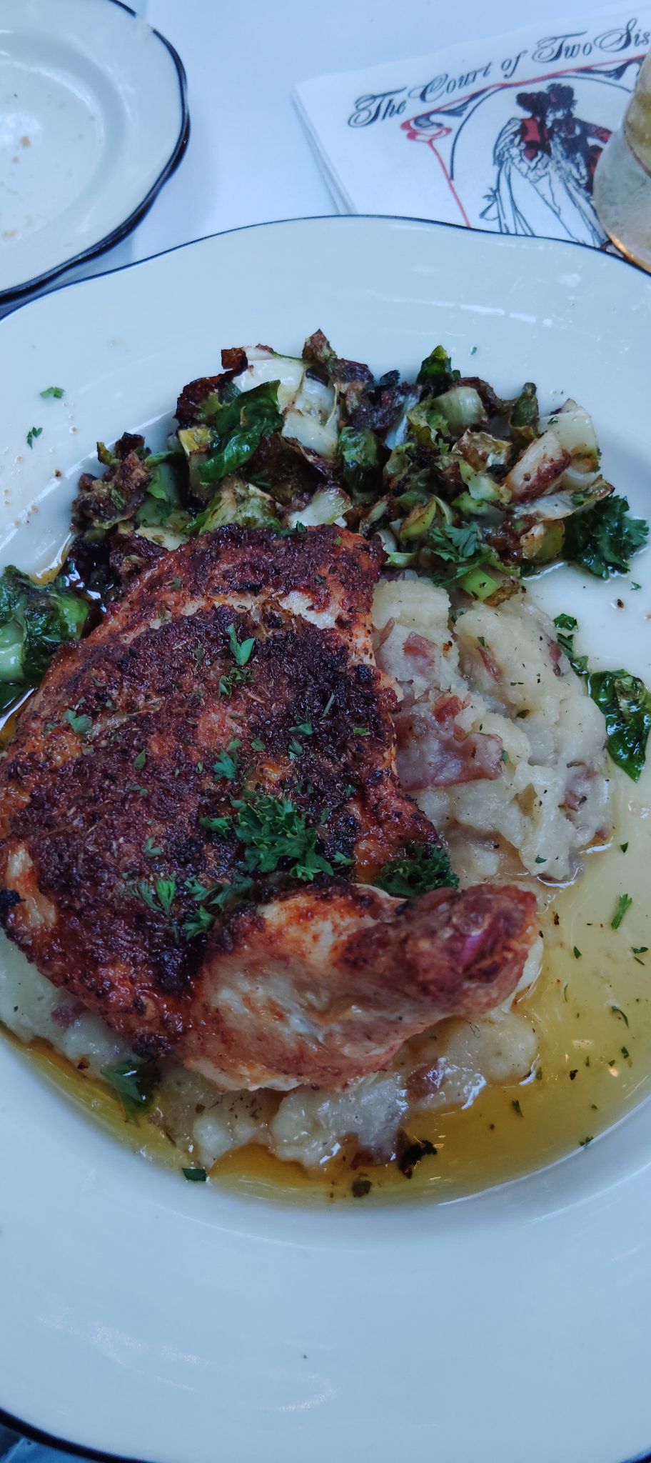 By now its 7 PM and way past my dinner time so I went to try out The Court of Two Sisters. If you want another take on this restaurant check out Shaun’s Visit. I came in the back door, found the hostess and looked over the dinner menu and decided for the Chef’s Three Course Meal. I started with Turtle Soup, my main was blackened chicken with brussels sprouts and mash potatoes ending with bread pudding in a whiskey sauce.