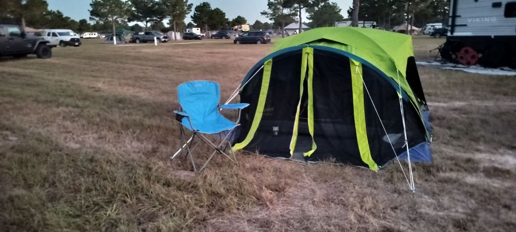 I arrived just a bit after 11:30 PM and quiet hours start at 12 AM, so I was rushed to find a site, in the dark. Why, yes the moon was nearly full, but other than one or two street lights on the dirt roads it was very dark, and the street signs didn’t really glow in my truck’s headlights. I did find an open area and someone was setting up their RV across the road. I decided to gear up with my head lamp and pitch my tent. I should have aired up the mattress first, since I completed the tent placement a few minutes after the bonfire revealers headed to their abodes. The ground was hard, oh yeah that moon… Seems my tent’s back panel is all darkened mesh, so the moon light shows right through. Glad I brought my eye mask. 👍