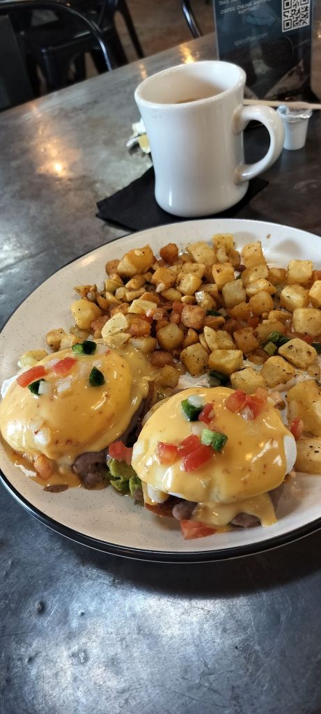Tomorrow’s breakfast will be at the Grapevine Cafe, because I love their crab cakes and eggs benedict.