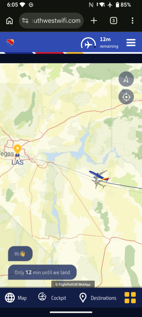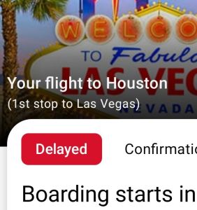 OMG!!! I’ve never had my name called over the PA at an airport until today. Needless to say, my flight to Houston was delayed by over an hour. We even just sat on the runway for 30 minutes before being given clearance to takeoff because of the air traffic in Houston. I did make it to my connection, but when I looked at this flight to Vegas from Houston the other night it was fully booked. I think less than half the seats are filled. All those 5Ks I run came in handy today. I was only partial winded speed walking from gate 2 to gate 43. On to Vegas.